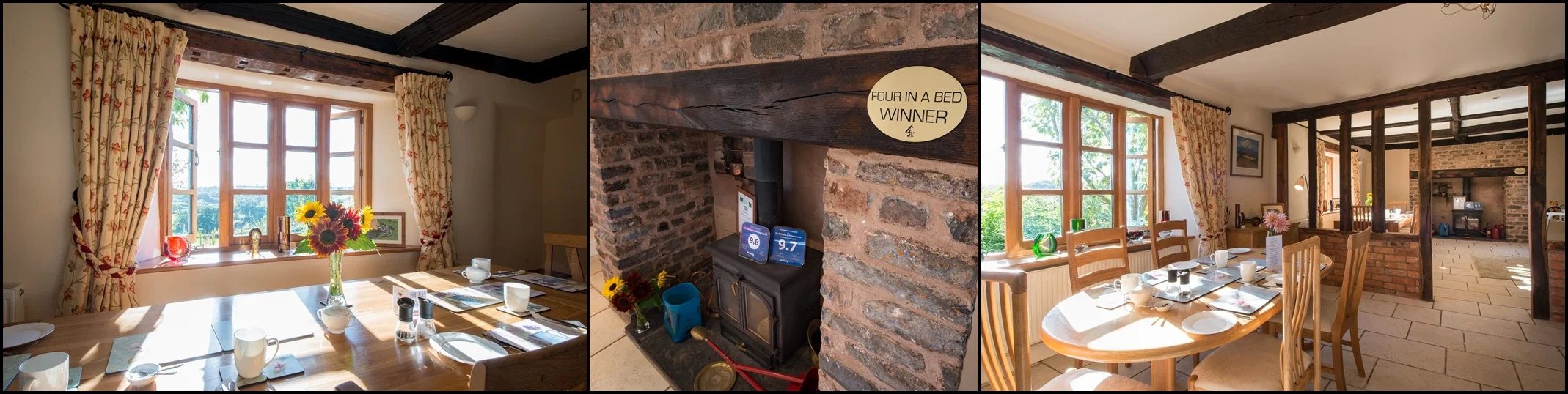 Breakfast is served in the lovely Tudor dining room in the main house. Wander over and indulge in a freshly cooked Full English, fresh fruit or Smoked Salmon with scrambled eggs. Take in the amazing views and watch the birds.